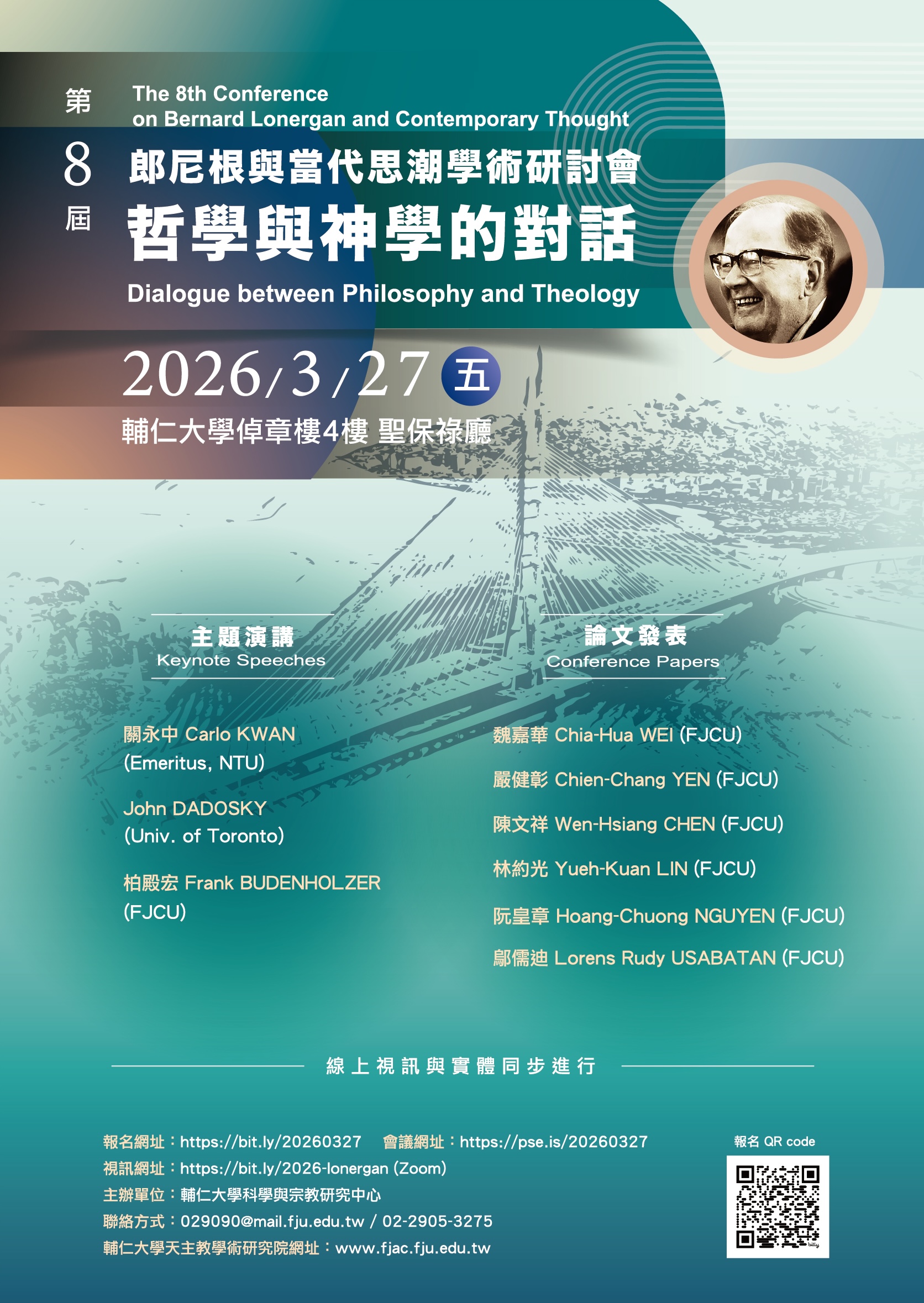 謹訂於2026年3月27日(週五)舉行「第八屆郎尼根與當代思潮學術研討會:哲學與神學的對話」,歡迎對郎尼根(Bernard Lonergan)思想有興趣者踴躍報名參加(線上視訊與實體同步進行)。